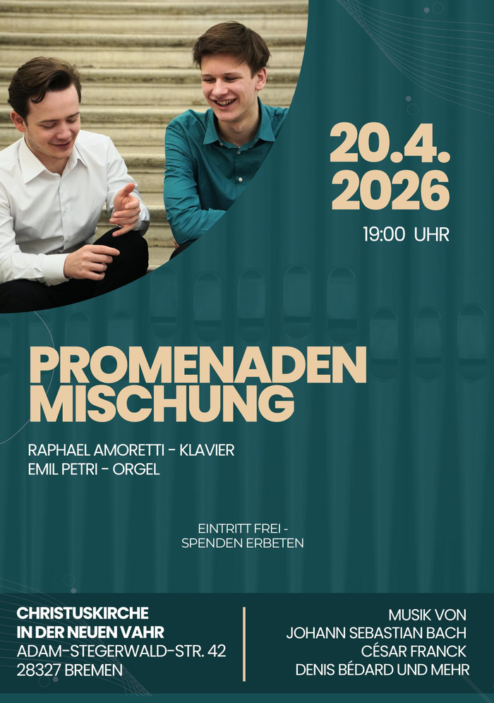 Klavier und Orgel – eine Kombination, die man nur selten in einem Konzert erleben kann – wohl auch weil die beiden Instrumente so unterschiedlich sind. Raphael Amoretti (*2007 in Bremen) am Klavier und Emil Petri (*2006 in Wien) an der Orgel wollen diese Lücke füllen und zeigen, wie gut diese scheinbare Promenadenmischung harmoniert. Beide sind Schüler am Wiener Musikgymnasium und konnten an ihren Instrumenten bereits große Erfolge bei Wettbewerben und Konzerten feiern. Raphael Amoretti gewann den Bremer Landeswettbewerb 2019 bei Jugend musiziert. Emil Petri wurde Bundessieger bei Prima la musica 2024 in Brixen. 2025 erhielt er das Kirchenmusik B-Diplom mit Auszeichnung. Doch auch als Duo sammelten die beiden bereits Konzerterfahrung. So traten sie gemeinsam bei Konzerten in Österreich und Deutschland auf – letztes Jahr auch schon in der Christuskirche.